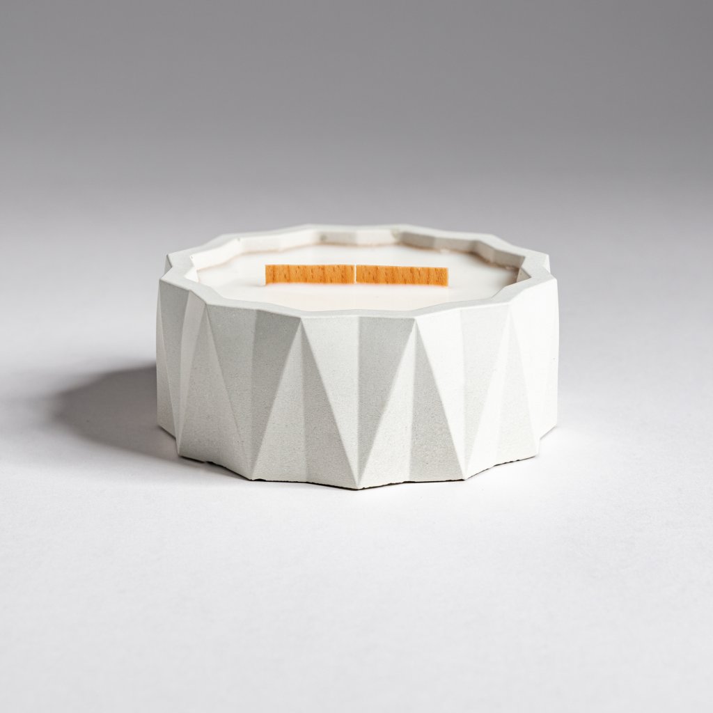 Každý kus je ručně vyroben z vlastního receptu přírodního pohledového betonu, jehož surová elegance vyniká v každém interiéru. Nabízíme ji ve dvou variantách – v přírodním šedém betonu a v luxusní bílé barvě. Doplňuje ho ekologická vosková směs z kokosového a sójového vosku – bez parafínu, bez toxinů, bez kompromisů. Dřevěný knot dodává ohni zvuk praskajícího krbu. Design podtrhuje minimalistickou krásu. Možnost opětovného doplnění mění svíčku v trvalý rituál.