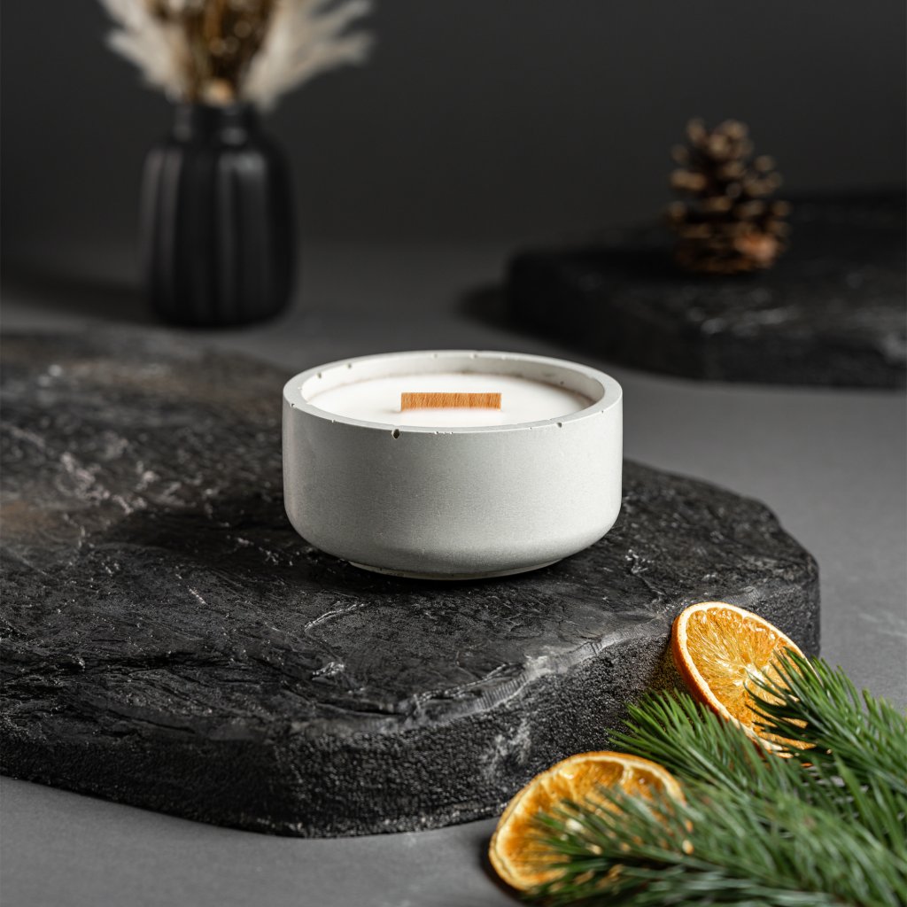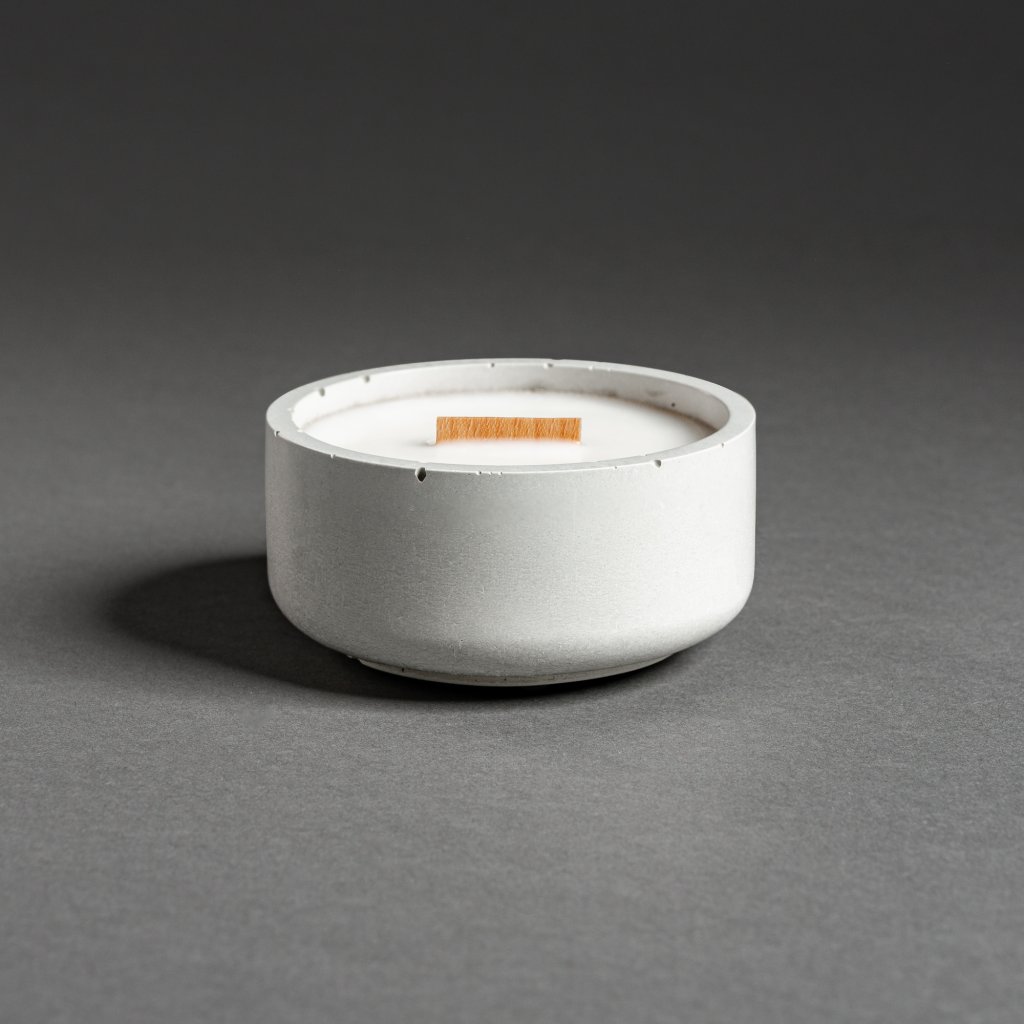 Každý kus je ručně vyroben z vlastního receptu přírodního pohledového betonu, jehož surová elegance vyniká v každém interiéru. Nabízíme ji ve dvou variantách – v přírodním šedém betonu a v luxusní bílé barvě. Doplňuje ho ekologická vosková směs z kokosového a sójového vosku – bez parafínu, bez toxinů, bez kompromisů. Dřevěný knot dodává ohni zvuk praskajícího krbu. Design podtrhuje minimalistickou krásu. Možnost opětovného doplnění mění svíčku v trvalý rituál.