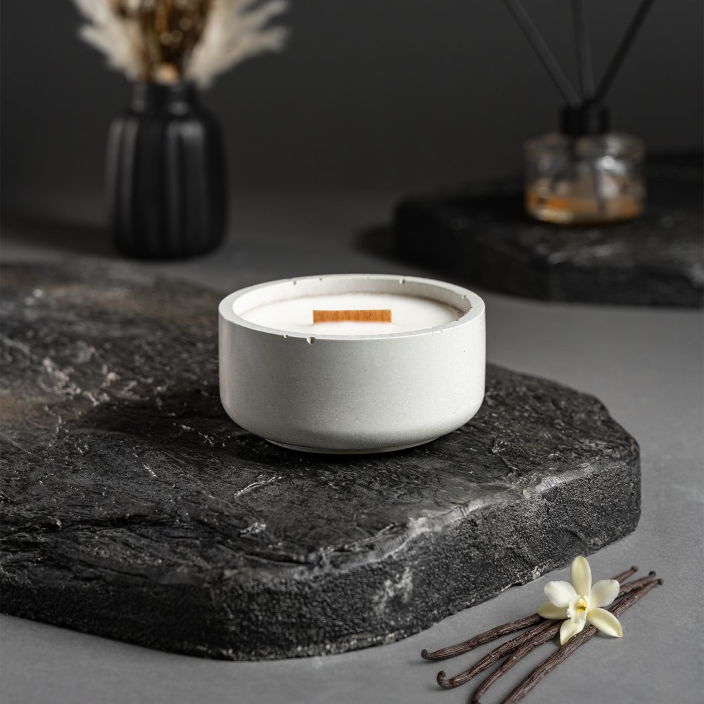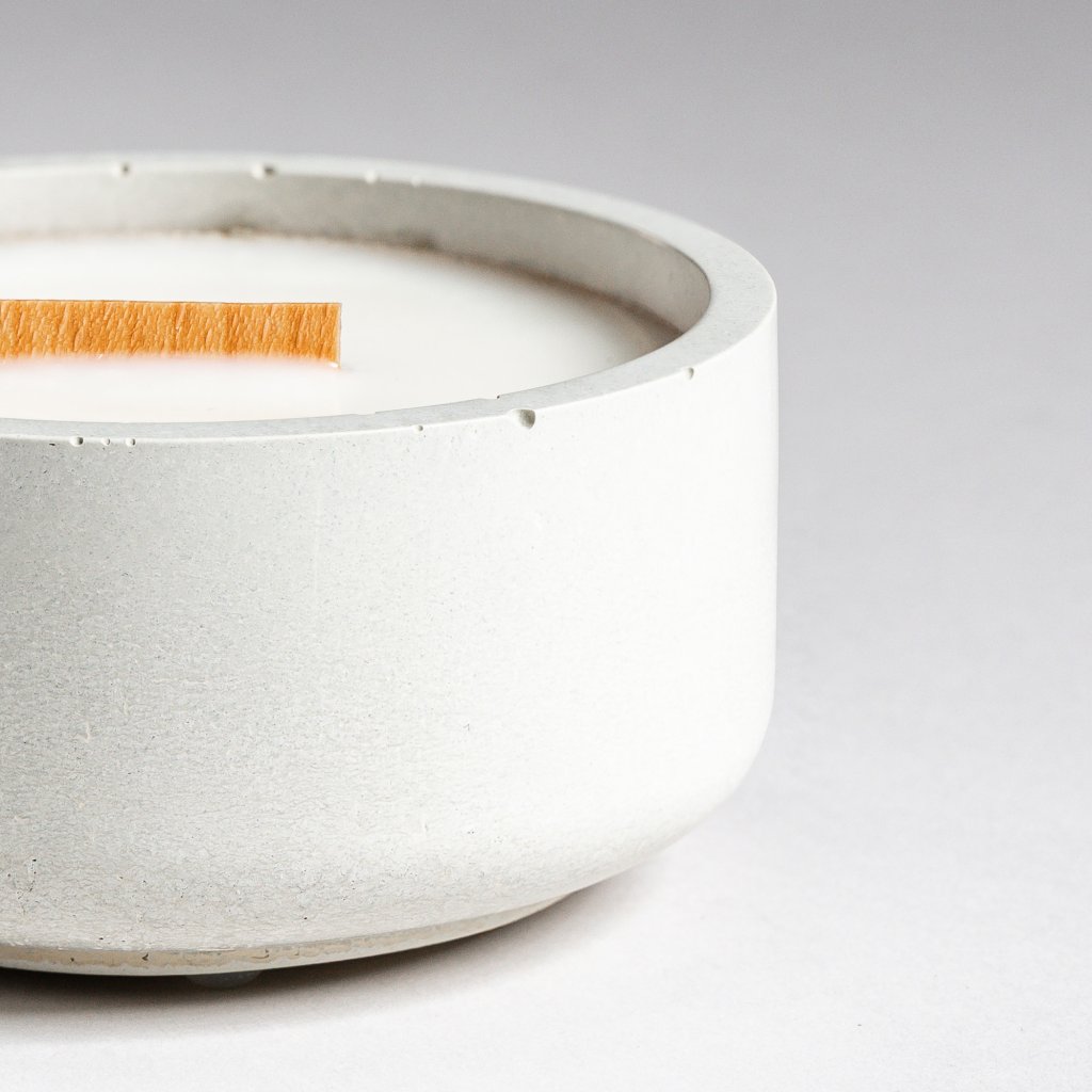 Každý kus je ručně vyroben z vlastního receptu přírodního pohledového betonu, jehož surová elegance vyniká v každém interiéru. Nabízíme ji ve dvou variantách – v přírodním šedém betonu a v luxusní bílé barvě. Doplňuje ho ekologická vosková směs z kokosového a sójového vosku – bez parafínu, bez toxinů, bez kompromisů. Dřevěný knot dodává ohni zvuk praskajícího krbu. Design podtrhuje minimalistickou krásu. Možnost opětovného doplnění mění svíčku v trvalý rituál.