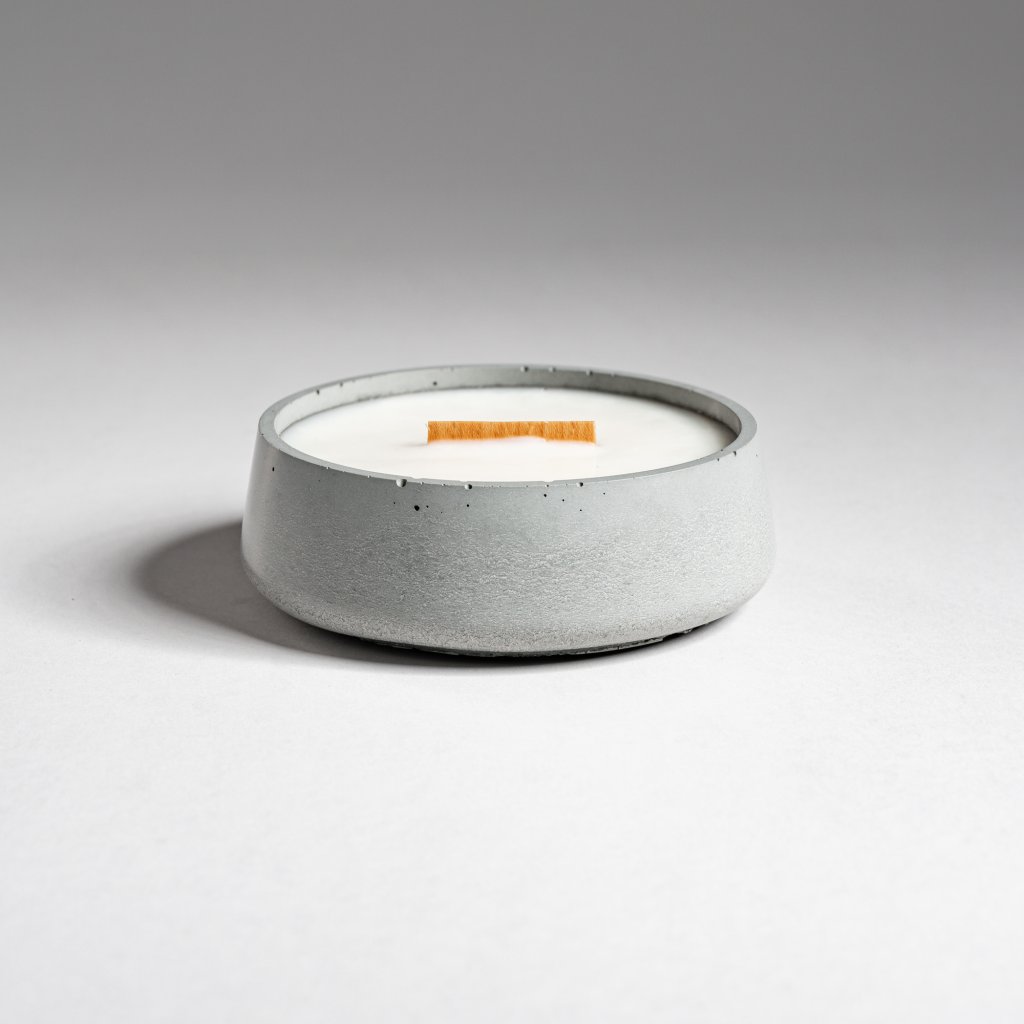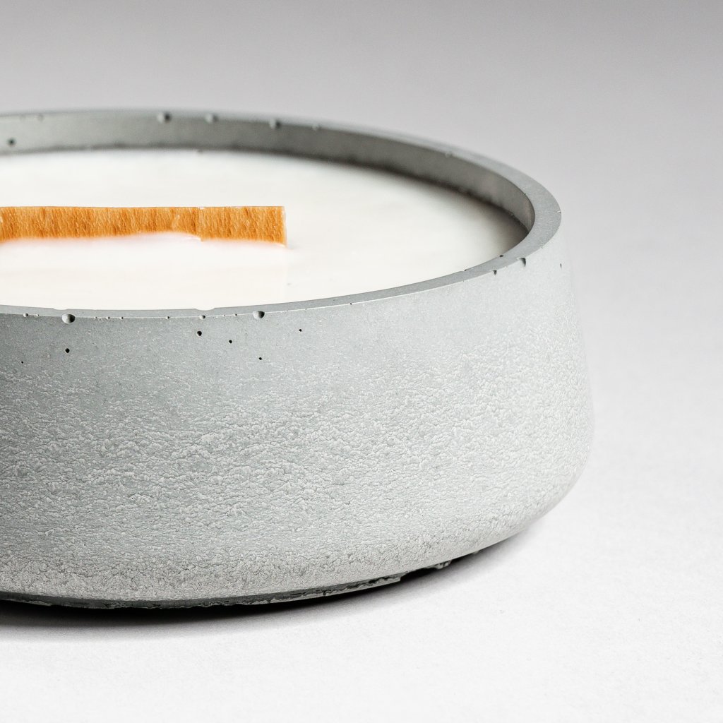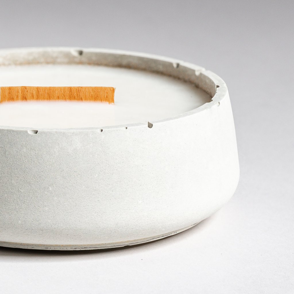 Každý kus je ručně vyroben z vlastního receptu přírodního pohledového betonu, jehož surová elegance vyniká v každém interiéru. Nabízíme ji ve dvou variantách – v přírodním šedém betonu a v luxusní bílé barvě. Doplňuje ho ekologická vosková směs z kokosového a sójového vosku – bez parafínu, bez toxinů, bez kompromisů. Dřevěný knot dodává ohni zvuk praskajícího krbu. Design podtrhuje minimalistickou krásu. Možnost opětovného doplnění mění svíčku v trvalý rituál.